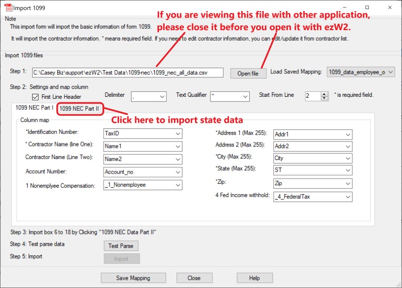 With ezW2 software, you can import 1099 NEC form data from the external .csv file in a few clicks.
