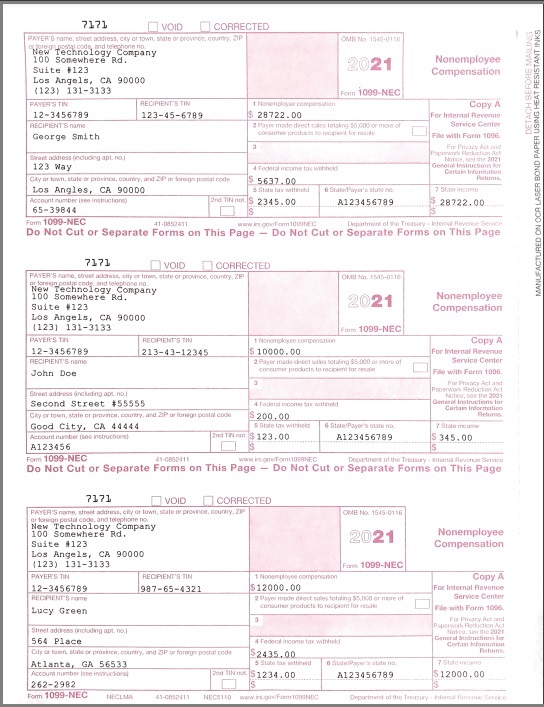 With ezW2 (or ez1099) software, you can print 1099-NEC forms Copy 1, 2, B, C on white paper. IRS does not certify the substitute forms right now. You need to print 1099-NEC copy A and 1096 on the red-ink forms.