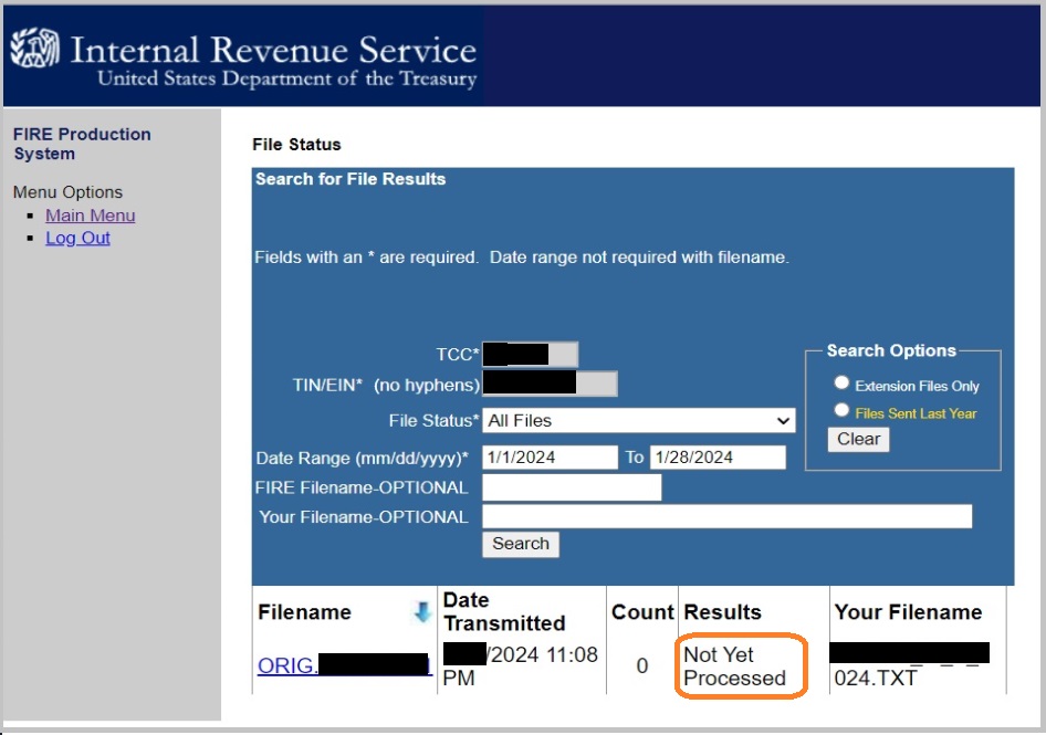 days or if you receive an email indicating the file is bad, log back into the IRS FIRE System and select "Check File Status".