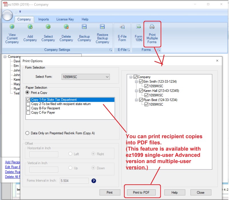 ez1099 can paper print 1099s forms. The advanced version can also convert the recipient copies into PDF format files. So employers can go green by sending the forms to recipients electronically.