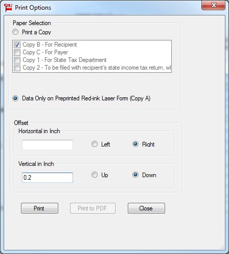 Most customers should be able to print forms with default set up. If your printer feeds paper differently, you can edit the offset values to adjust printing position. ie: you can increase the value for Up to print data higher.