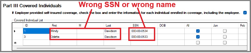 This is the error in 1095C form part III. IRS cannot find the covered individual SSN or name in their database.
