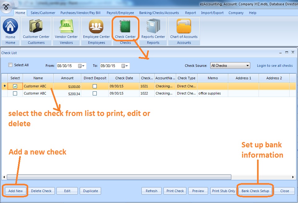 The default set up allows ezAccounting software to print check-on-top format check on blank stock. If you need to change check format, check paper or you need to customize check with different font size, font type, logo, extra labels, you can check the links below.