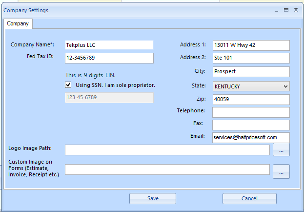 - Input Logo image path and Custom Image Path. Logo image will appear on checks and all print out. You can optionally print custom image on Invoice, Estimate, Receipt etc. You can leave those text boxes blank if you do not need to use those images.