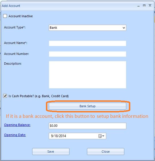 You need to set up the bank account to print checks. If you add or edit an account, you can click the "Bank Setup" button to input bank account information for check printing feature. (Click image to enlarge)