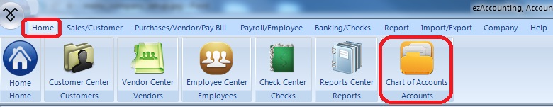 You can click the top "Home" tab, then click the sub menu "Chart of Account" to open the Chart of Account screen (Click image to enlarge)