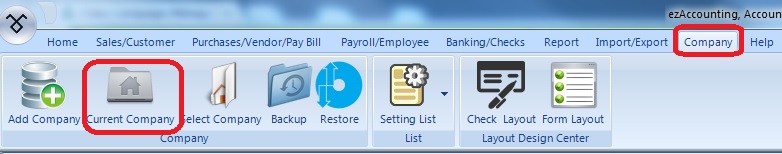 Start ezAccounting application, click the top "Company" tab, then click the sub menu "Current Company" to open the company setup screen