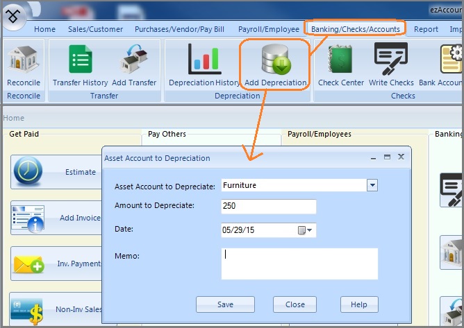 • Step 2: Click the top menu "Banking/Checks/Accounts" then click sub menu "Add Depreciation" to enter depreciation entry.