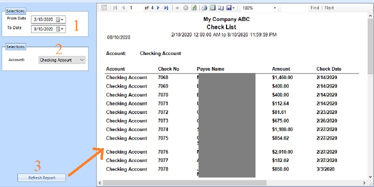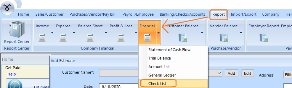 You can start ezAccounting, click the top menu "Report" then sub menu "Financial", and then click "Check List" to view the check list report screen.