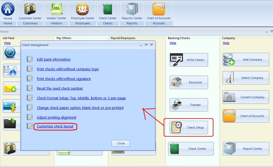 Start ezAccounting software, and then click the "Check Setup" button from the main panel, then click "Customize Check Layout" to view the layout screen.