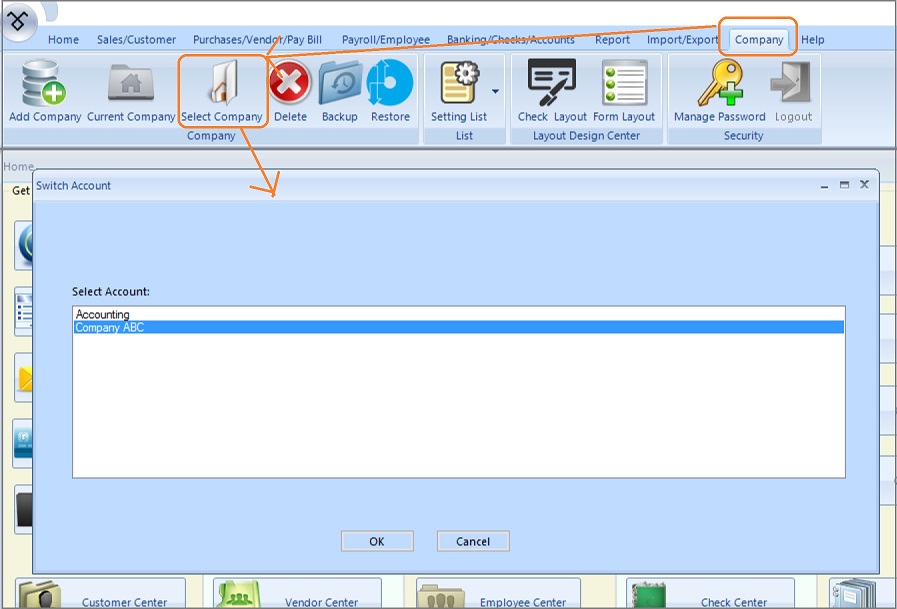 You can ezAccounting application top menu "Company" then "Select Company" to change the current company account.
