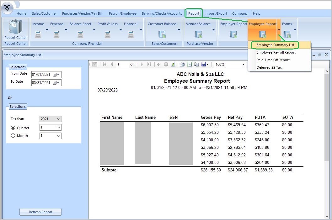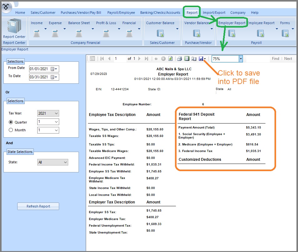 Start ezAccounting software, click the top menu "Report" then "Employer Report" view the "Employer Payroll Report". You change the report criteria to generate a new report.