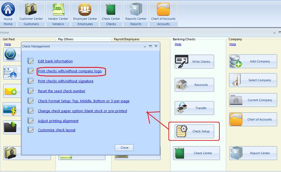 1.1 Start ezAccounting software, and then click the "Check Setup" button from the main panel, then click the "Print checks with/without company logo" button.