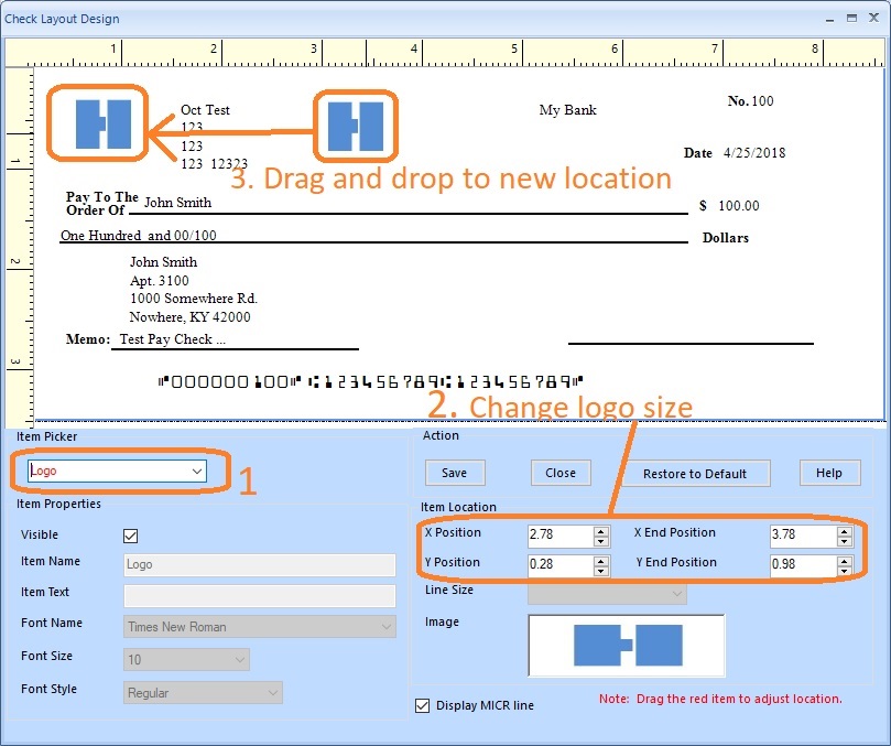 2.2 Double click the logo on check to select it, then you drag and drop it to a new location.