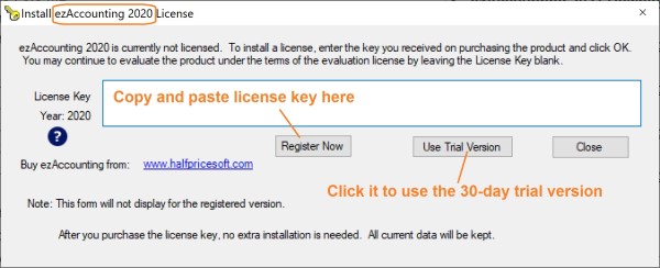 You can copy and paste key code here and click the "Register Now" button. If you register the key code successfully, You will not see this popup screen next time you start ezAccounting software.
