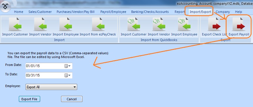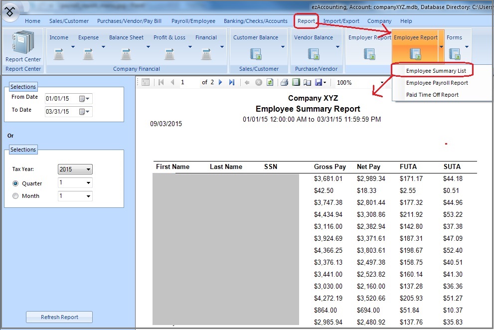You can double click the desktop ezAccounting shortcut icon to start ezAccounting. You can click the top menu "Reports" and click the sub menu "Employer Report" to the employer summary report.