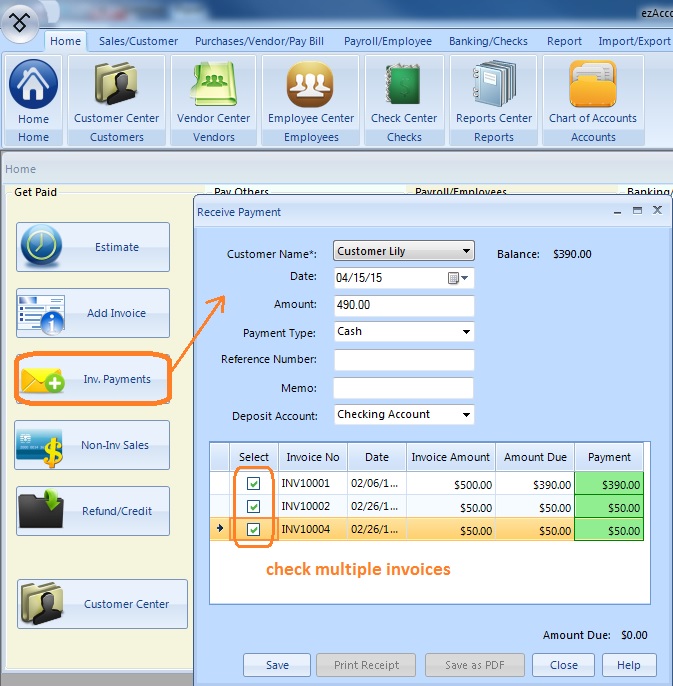 ezAccounting software is very flexible. You can apply single payment to multiple invoices for the same customer easily.