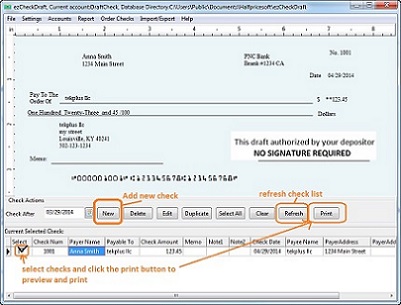 | - Print pre-approved draft check to receive payment via phone, email, fax and online quickly - Print unlimited draft checks on blank stock - Print checks with MICR encoding line - Support unlimited bank accounts - Print check with stubs - Supports check-on-Top and 3-per-page formats - Print multiple checks with one click - Write recurring checks easily | Yes | Yes |