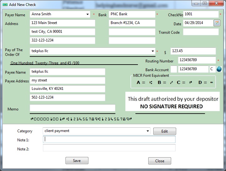 | - Print pre-approved draft check to receive payment via phone, email, fax and online quickly - Print unlimited draft checks on blank stock - Print checks with MICR encoding line - Support unlimited bank accounts - Print check with stubs - Supports check-on-Top and 3-per-page formats - Print multiple checks with one click - Write recurring checks easily | Yes | Yes |