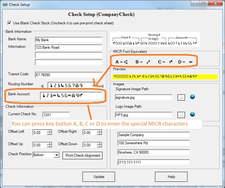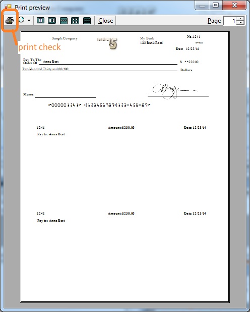 Click the top menu "Settings->check setup" to open the check setup page. Set up your check information and add your company logo file there.