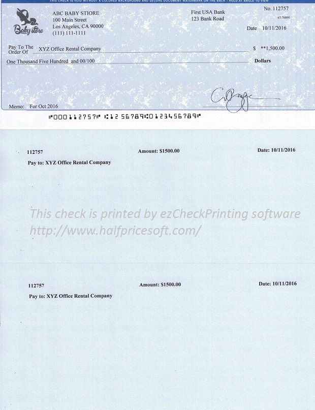 With ezCheckPrinting software, you can print on standard size checks or on 8 x 11-inch pages with check-on-top, check-in-middle, check-at-bottom and 3-per-page formats.