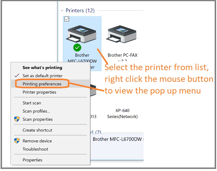 - Select target printer from list, then right click the mouse button to view "Printing preferences".