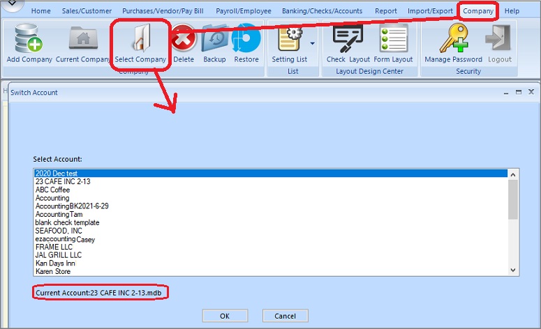 You can start ezAccounting, click the top menu "Company" then "Select Company" to see the current company account.