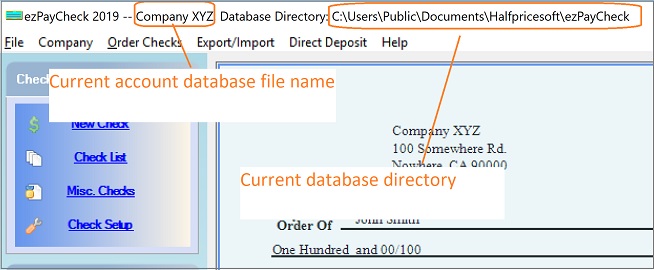 You can start ezPaycheck and view the current account database file name from the top menu. The file name is behind "ezPaycheck 20XX" and before "Database directoy". (Note: If you have multiple accounts, you can click the top menu "Company" then "Select Company" to change the current account.)