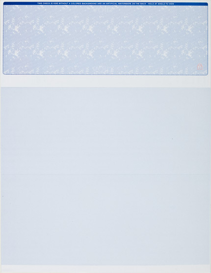 | Check-on-top Format Business Blank Check Stock Sheet size: 8-1/2" x 11"; Perforated Paper at 3-1/2", 7" to the top; Color: Blue; Form 1000 Business Standard