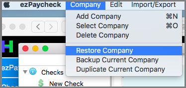 2.1. Start ezPaycheck, then click the top menu "Company->Restore company" to open the Database Restore screen.