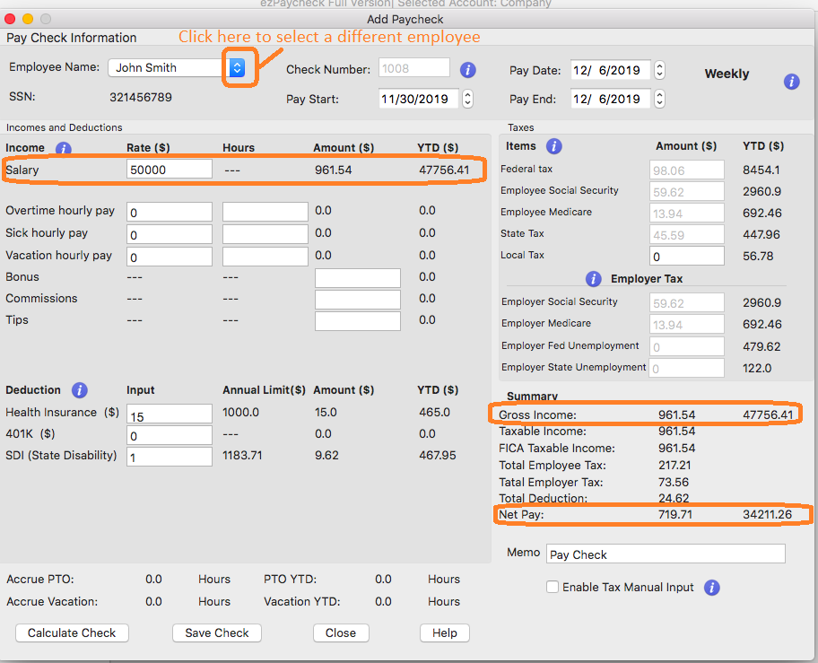 - Click the CLOSE button to close this screen for other operations (such as adding check for another employee or printing checks)