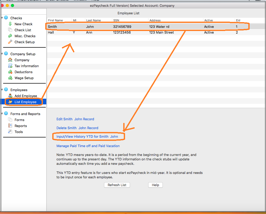 Start ezPaycheck application, click the left menu "Employees" then click the sub menu "Employee List" to view employee list. Select Ryan from Employee list and open YTD manually input screen.