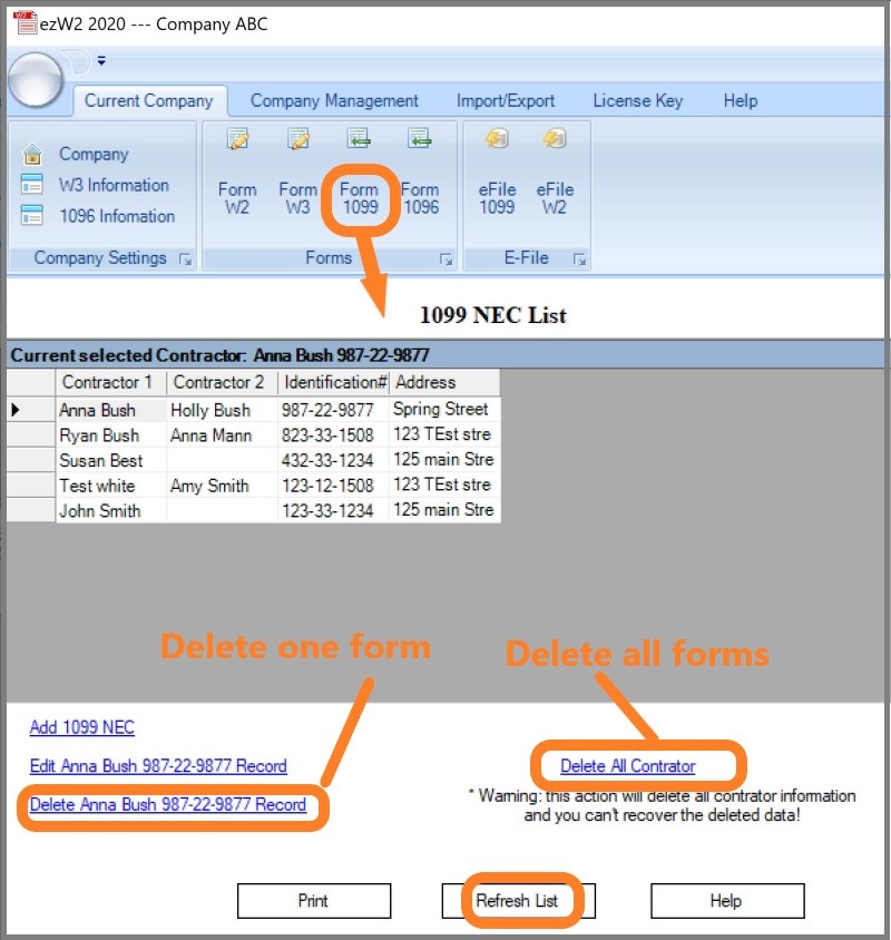2.3 You can click the top menu "Current Company" then "Form 1099" to view 1099-NEC form list. You can delete all contractors and tax forms from this screen if needed.