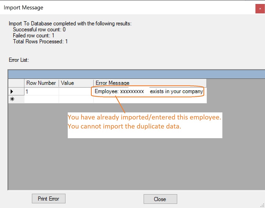1. "Employee XXXXX exists" error.