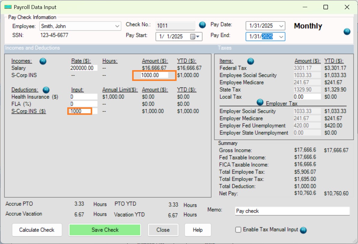 ezPaycheck payroll software is very flexible. You can follow this guide to handle the payment for S-Corp officer health insurance.