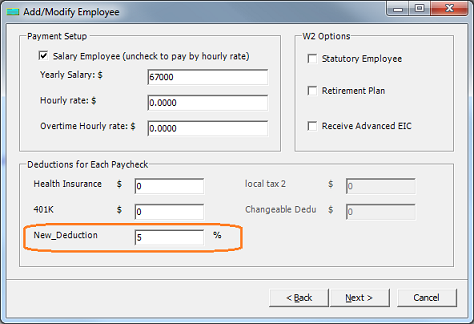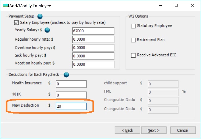 ezPaycheck payroll software is very flexible. With ezPaycheck, user can easily add a new deduction to handle IRA plan, insurance, garnishment, donation, dependent care, flexible account, local taxes or more. Here are the steps on how to add a new payroll deduction: