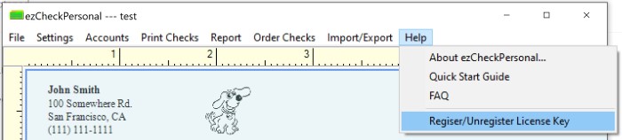 - Start ezCheckPersonal on the old computer, click the top menu "Help" then click the sub menu "register/unregister license key".
