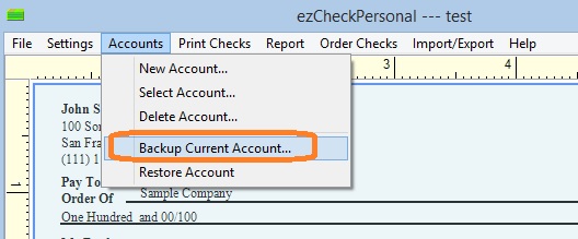 Step 1: Start ezCheckPersonal and click the top menu "Accounts" then "Backup Current Account" to open backup screen