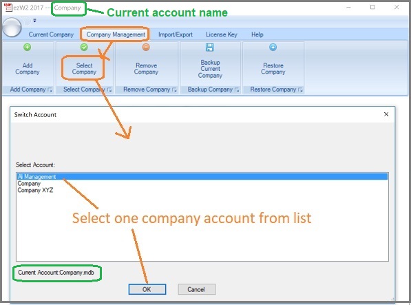 Start ezW2, click the top menu "Company Management->Select Company" to switch the current account.