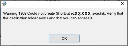 "Warning 1909: Could not create shortcut .lnk. Verify that the destination folder exists and that you can access it."